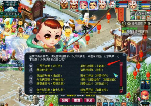 2023年1月13日12点至2月10日12点,侠士们(≥50级,5人组队)可在长安城(243,117)福禄童子处开启任务,赴各大门派拜年互动。